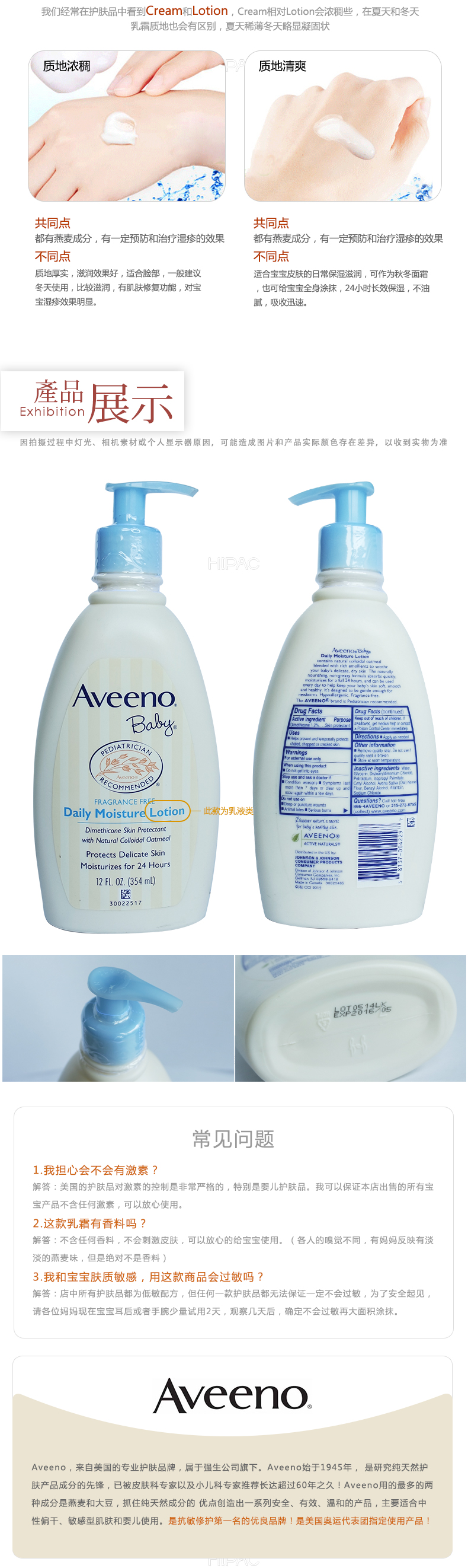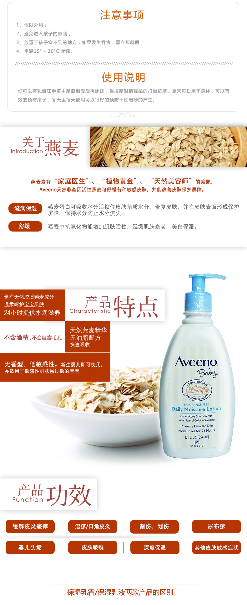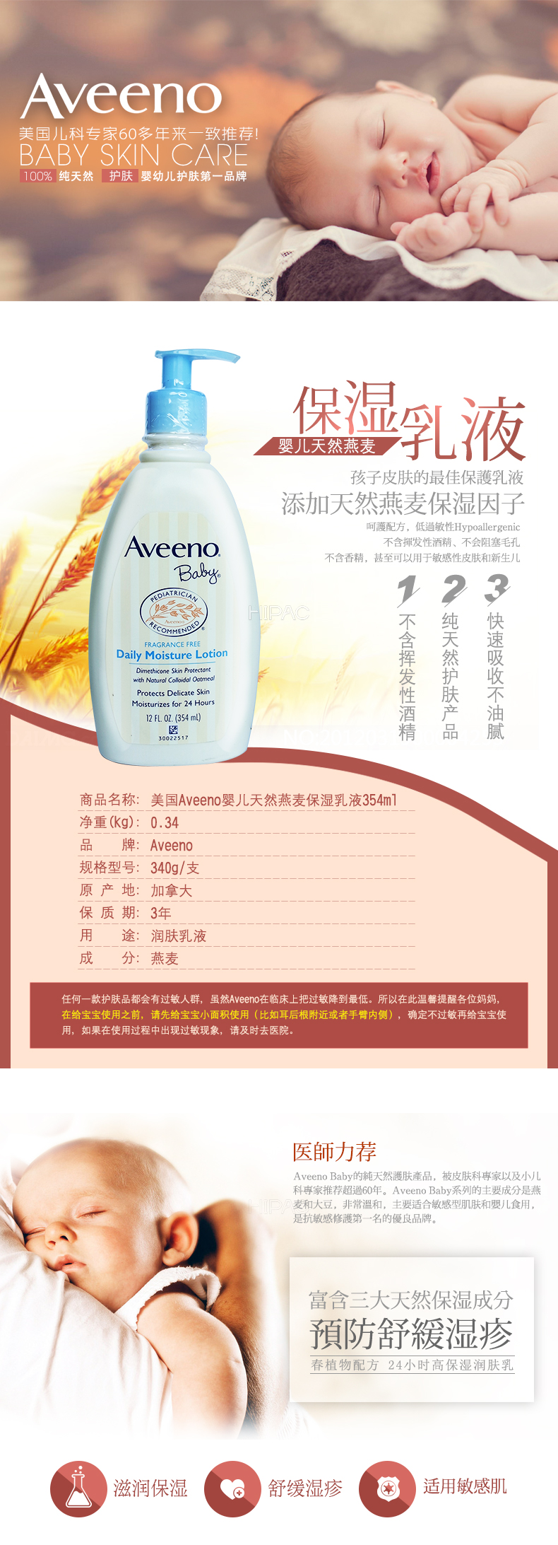 美国艾维诺婴幼儿天然燕麦润肤乳液(无香型)354ml浅蓝 中文标