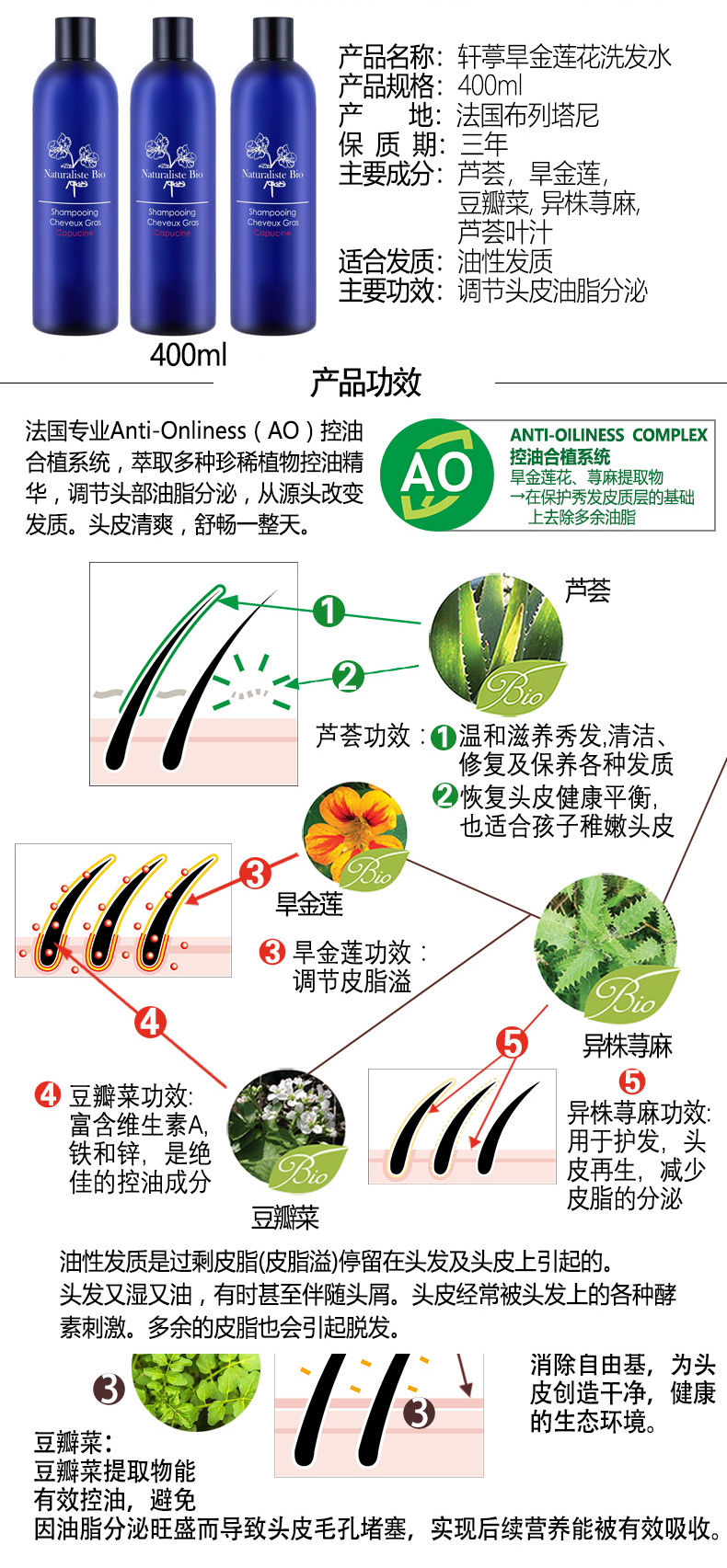 法国轩葶Naturaliste Bio有机旱金莲花洗发水400ml-适合油性发质
