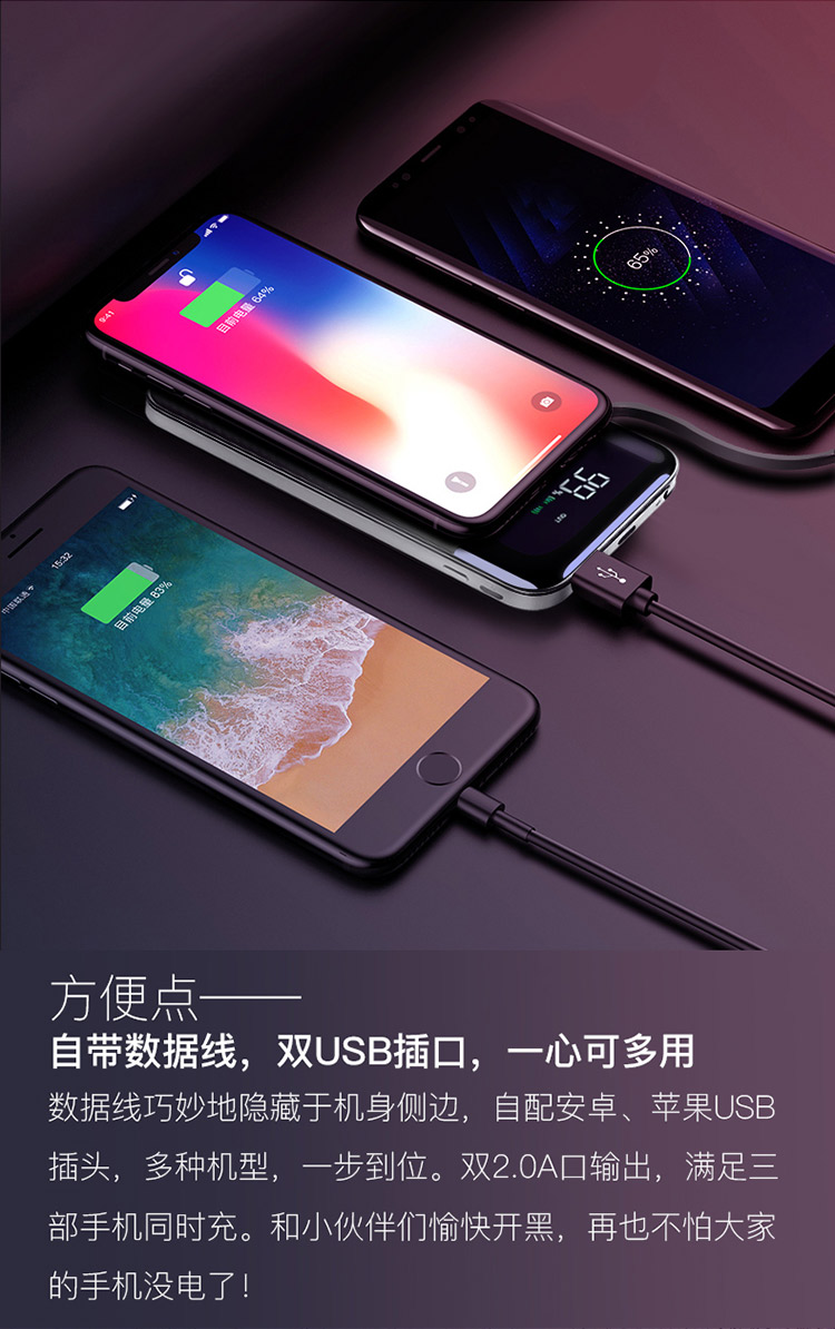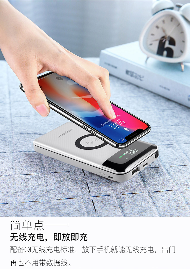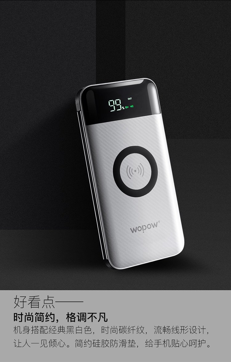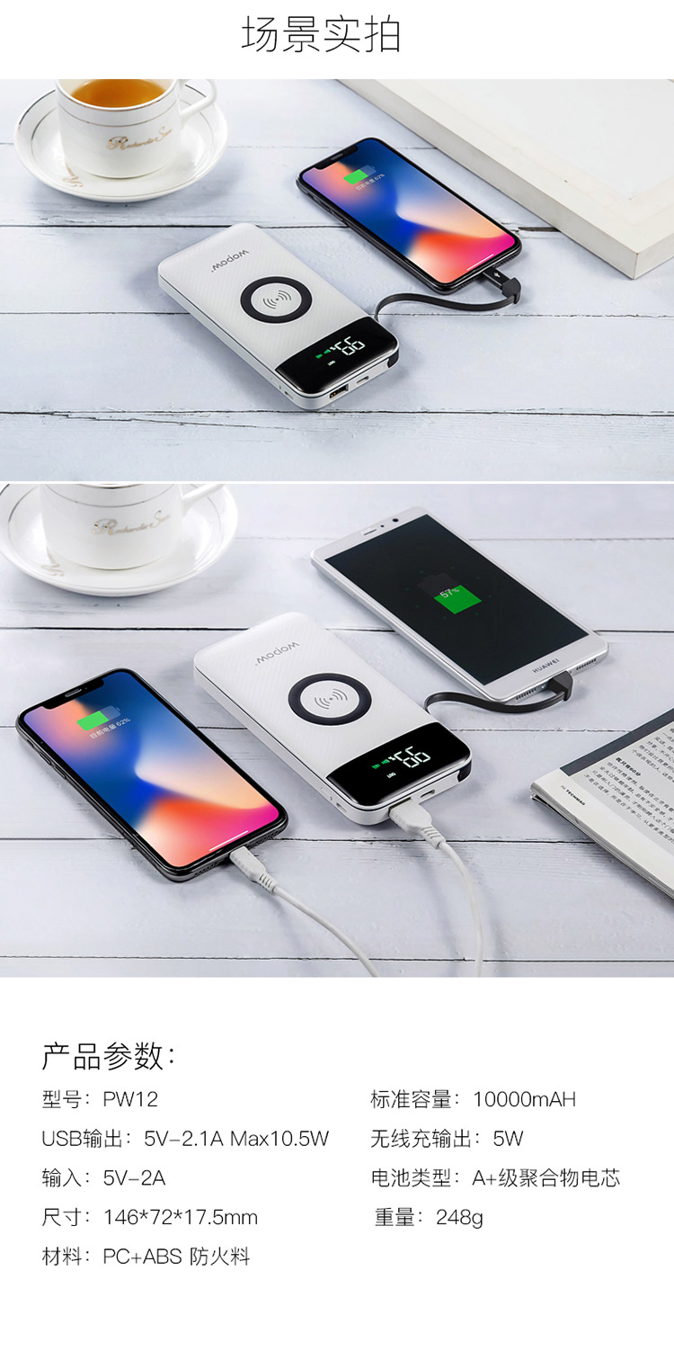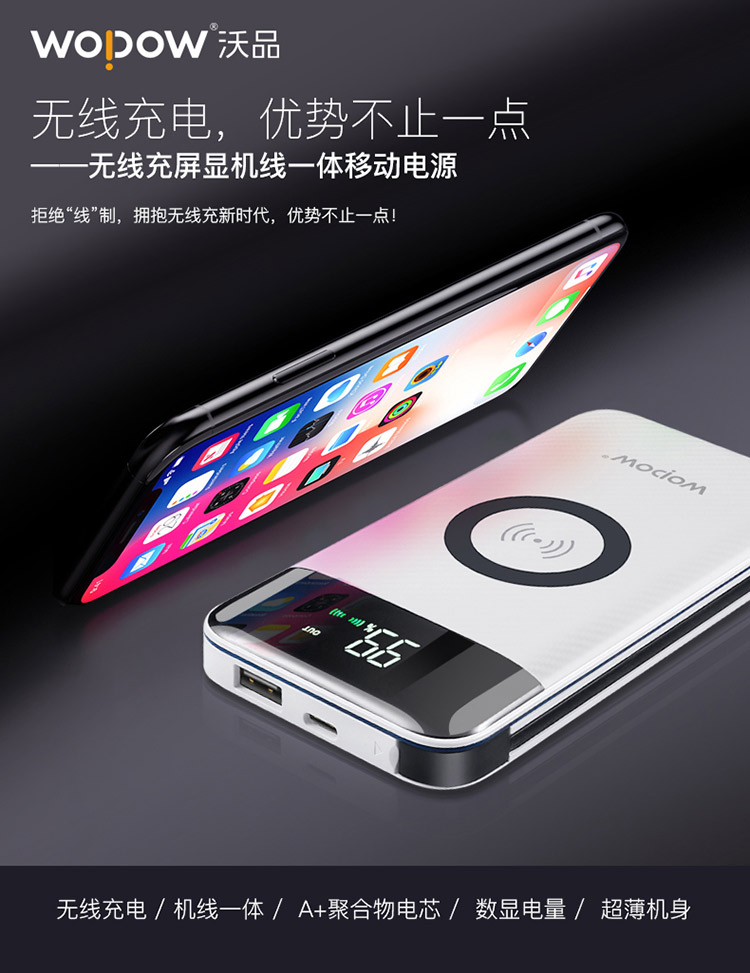 【授权商品】中国wopow/沃品 移动电源自带线机线超薄充电宝PW12 白色