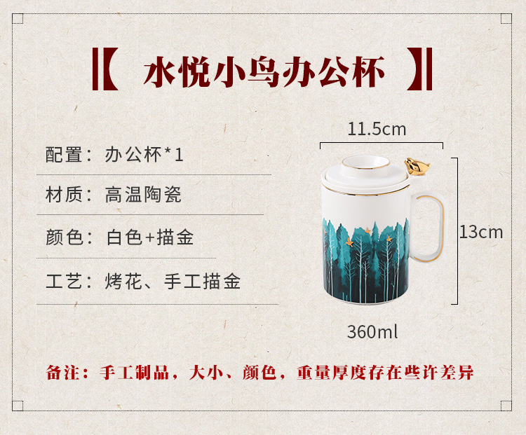 您所在的位置:首页 > 家居日用  > 茶具/咖啡具 > 茶杯  > 唯都多姿|水悦小鸟办公杯W-S33陶瓷茶杯泡茶杯水杯360ML办公杯
