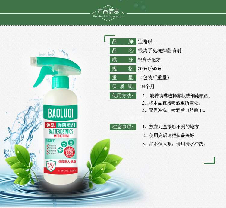 您所在的位置:首页 > 家居日用  > 家居日用 > 生活日用  > 宝路琪银离子居家免洗抑菌喷剂500ml