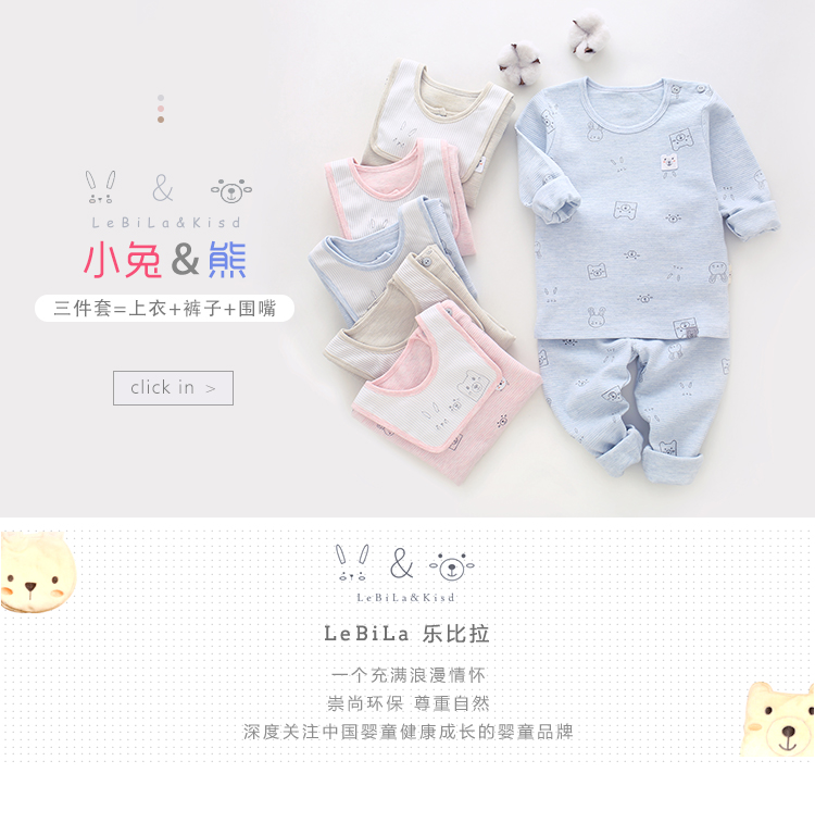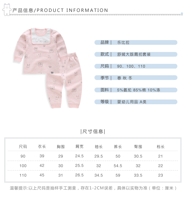 乐比宝宝内衣肩扣两件套家居服睡衣打底衣85325-6小兔与熊90-100-110粉