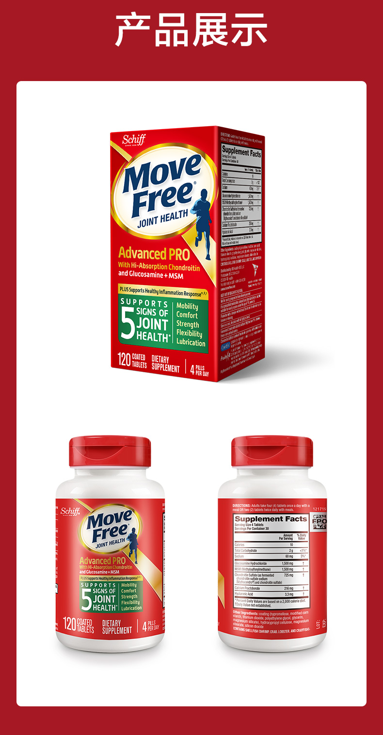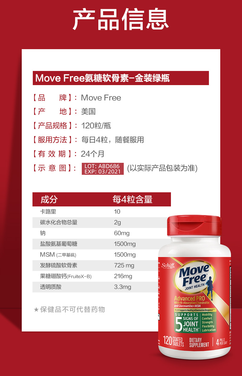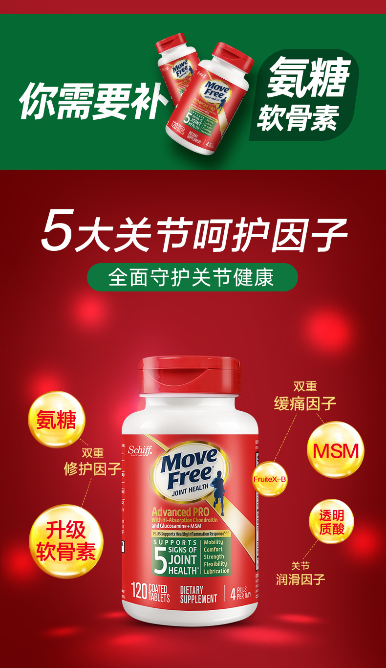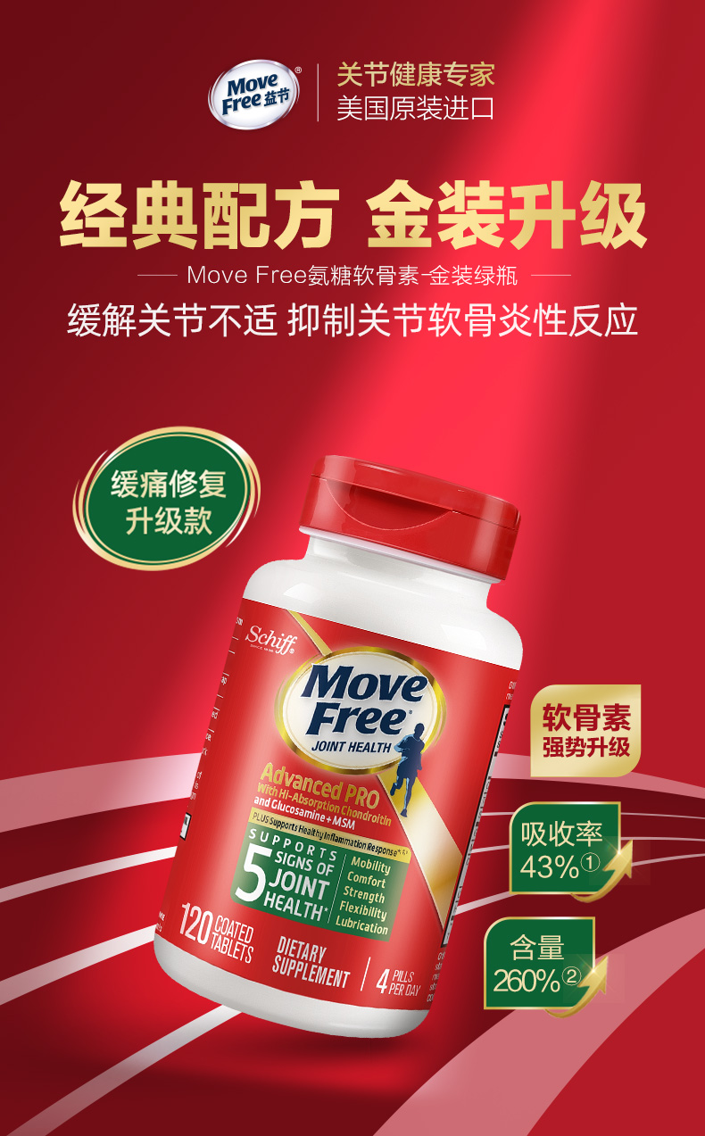 【保税直邮】Move Free氨糖高吸收软骨素加MSM金装绿瓶120粒