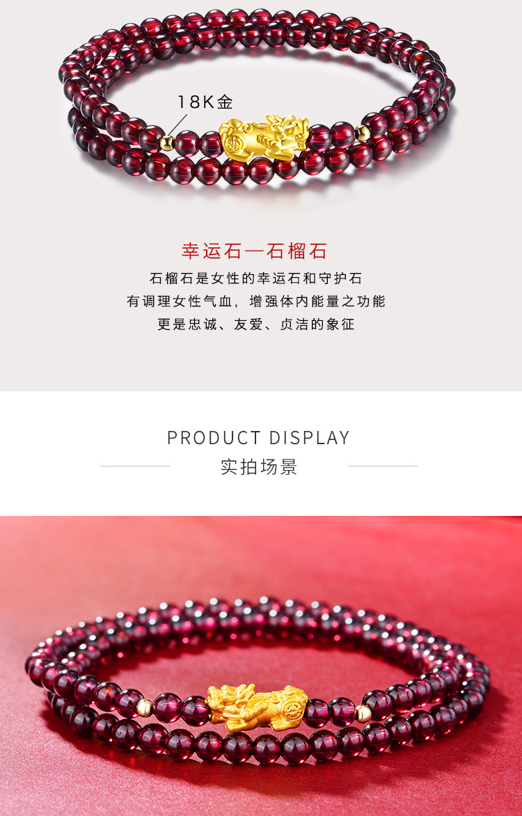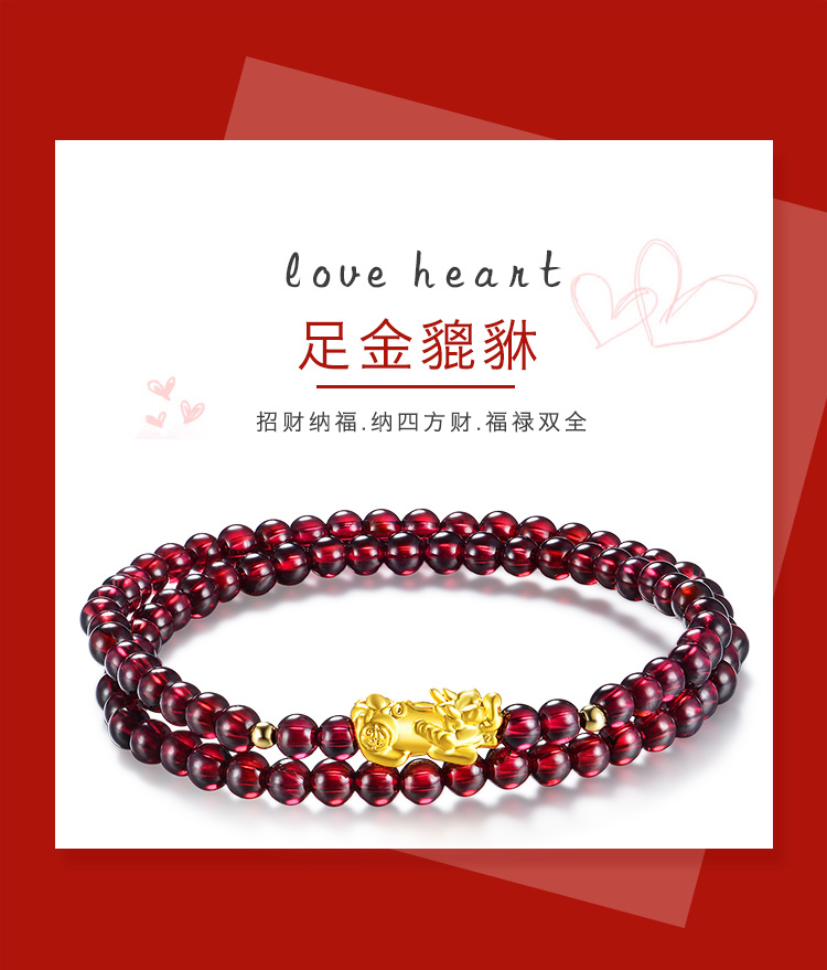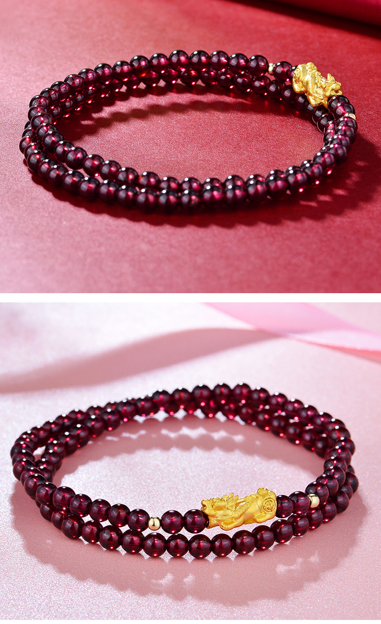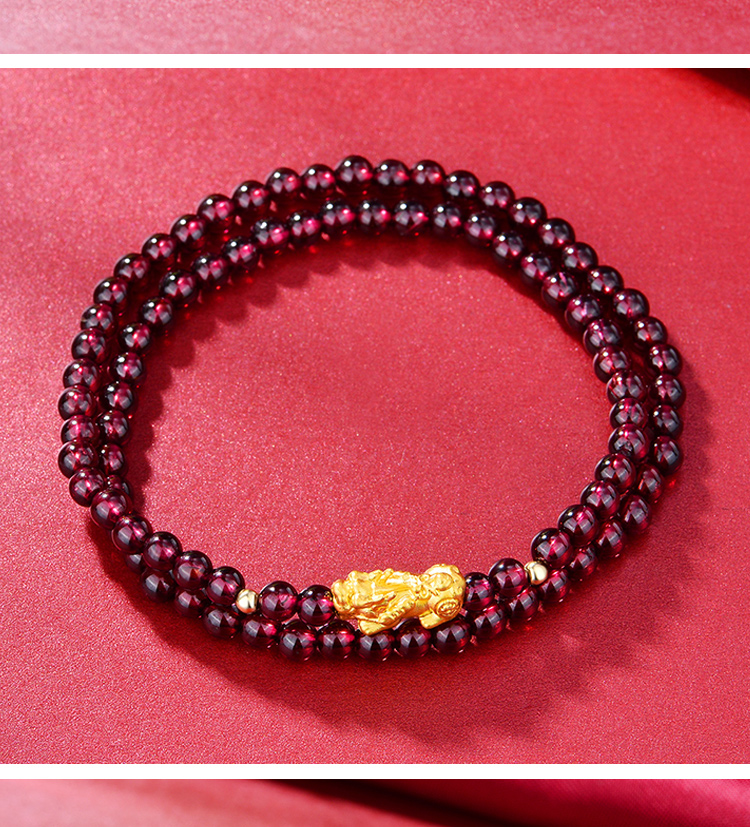 翠雅金楼999足金貔貅18K金转运珠配紫牙乌石榴石两圈手链