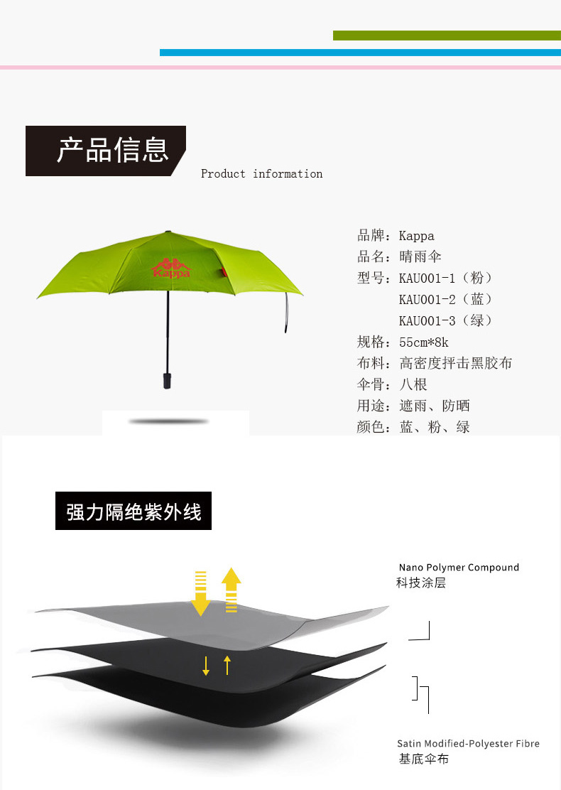 【授权商品】Kappa晴雨伞 遮阳防晒KAU001系列 雨伞雨具 粉色