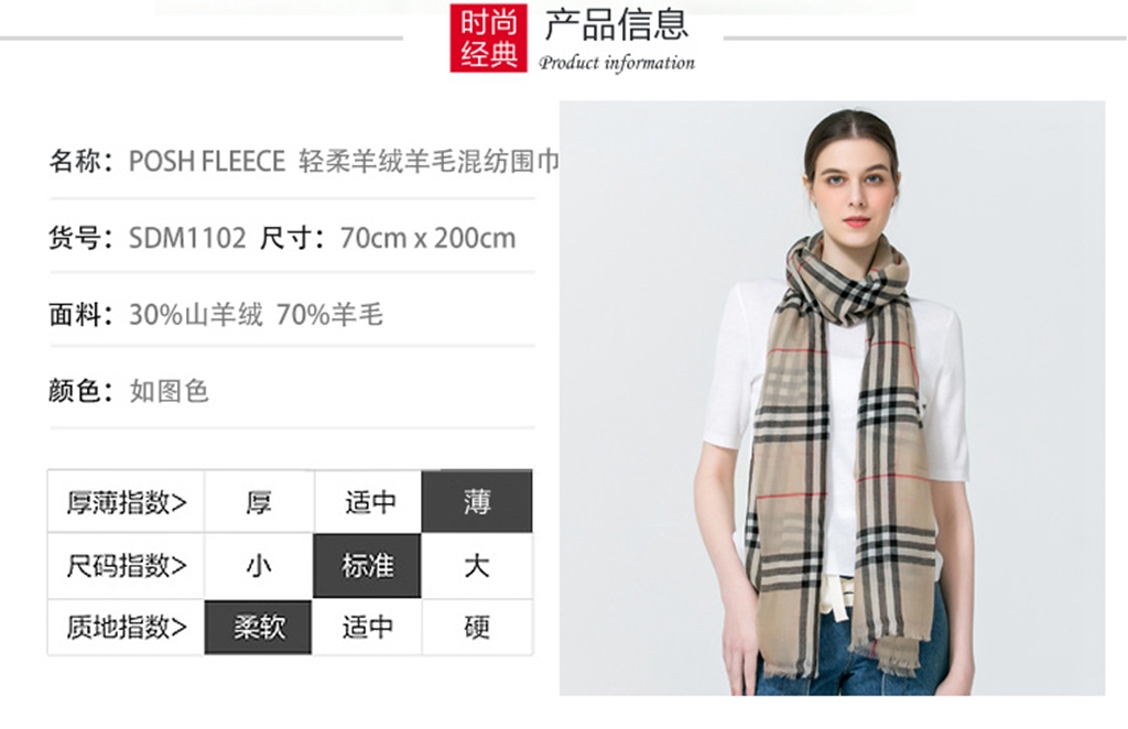 【澳洲直邮】Posh Fleece 澳洲羊绒羊毛混纺围巾 SDM1102 格子 70*200