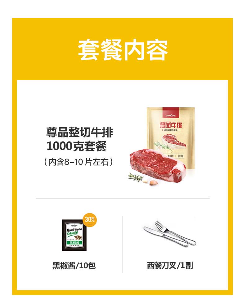 您所在的位置:首页 > 休闲食品  > 肉类 > 牛肉  > 澳大利亚顶诺尊品牛排500g/包 【1000g套餐 2包装】100g*10片 送1刀叉 10酱包 1煎锅 全国顺丰冷运