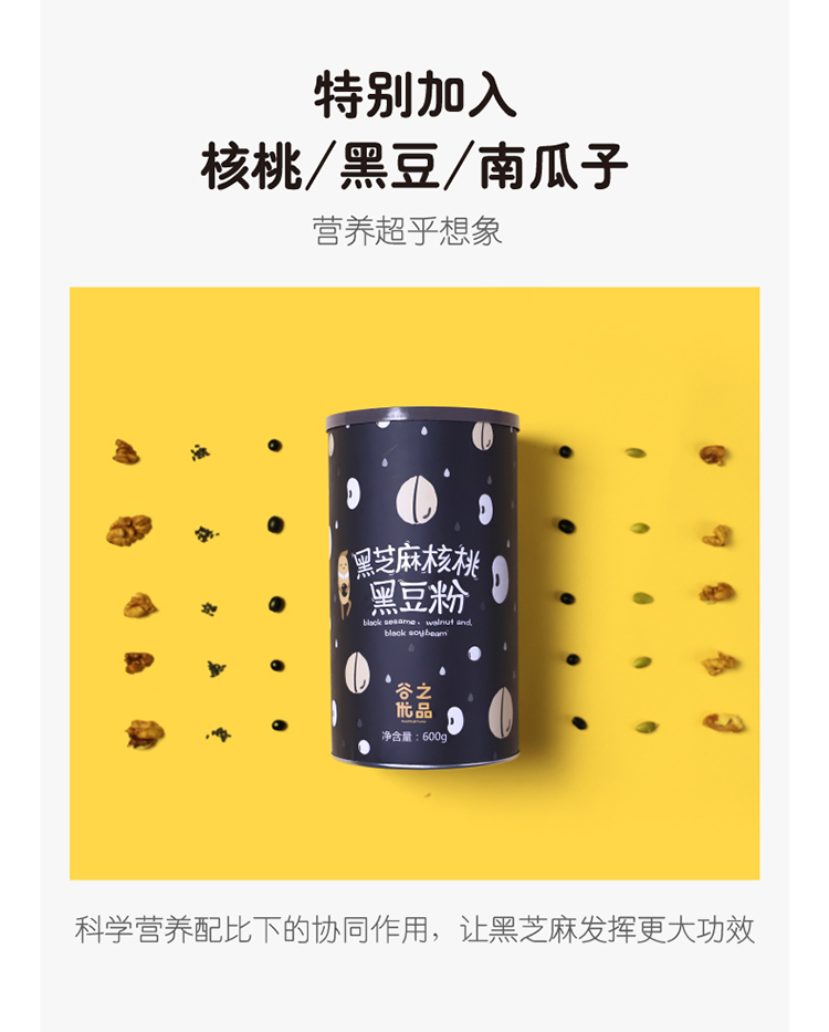 谷之优品黑芝麻核桃黑豆粉600g/罐无添加五谷杂粮益发乌发补脑益肾改善睡眠代餐粥营养粗粮早餐