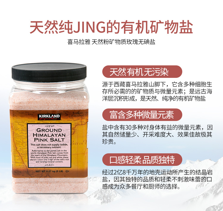 您所在的位置:首页 > 休闲食品  > 粮油调味 > 调味品  > 【美国直邮】Kirkland柯克兰 天然粉矿物质玫瑰无碘 调味料 2.27kg