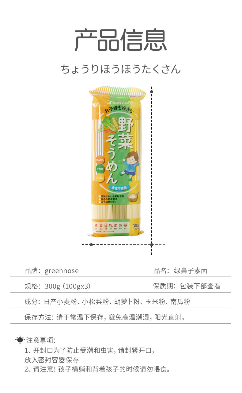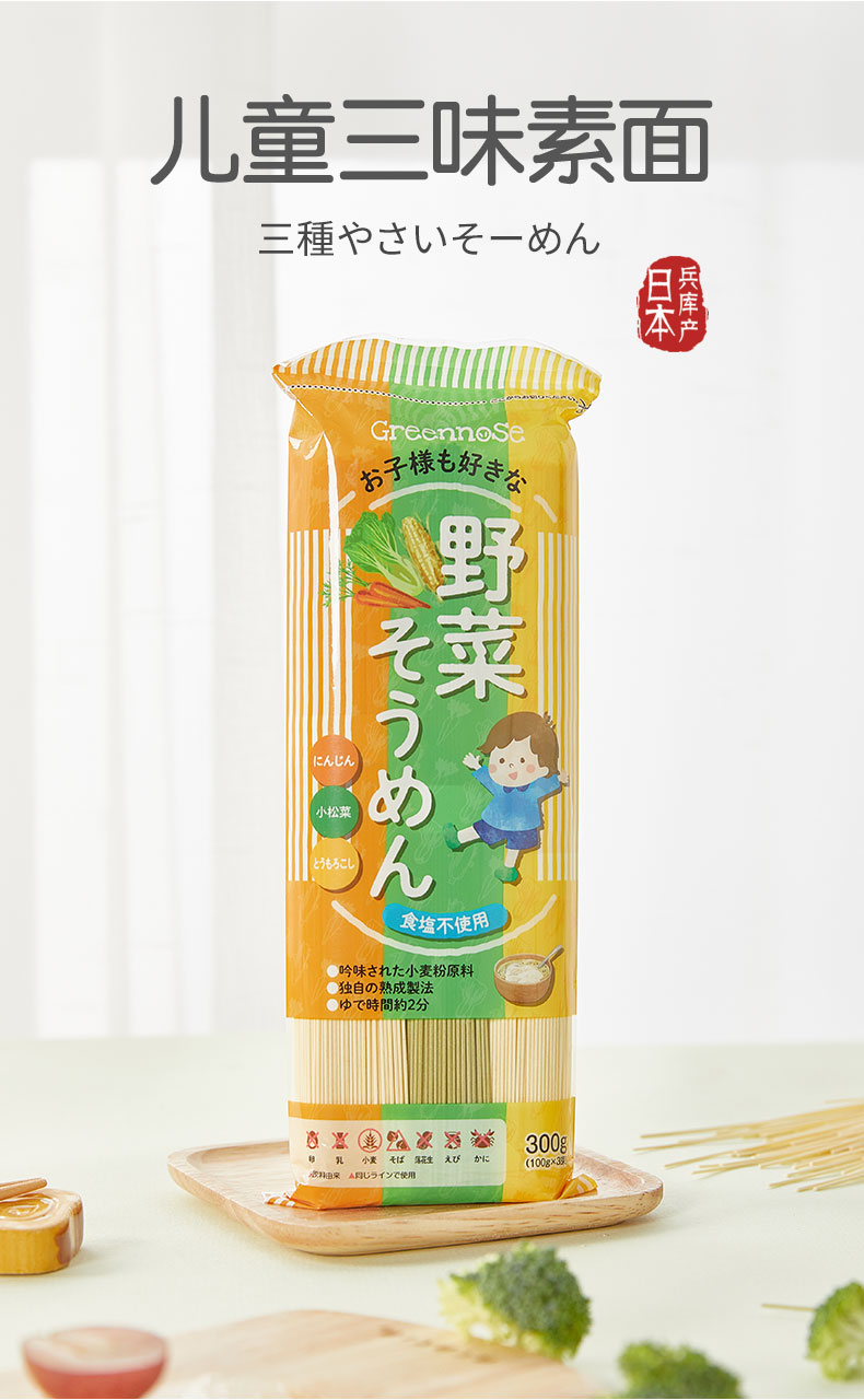 日本绿鼻子宝宝面条婴幼儿童营养蔬菜三色挂面辅食蔬菜细面300g