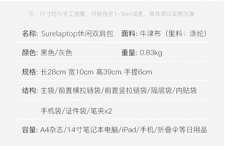 您所在的位置:首页 > 服饰箱包  > 功能箱包 > 电脑包  > surelaptop爆款简约时尚双肩包大容量背包5009 黑色