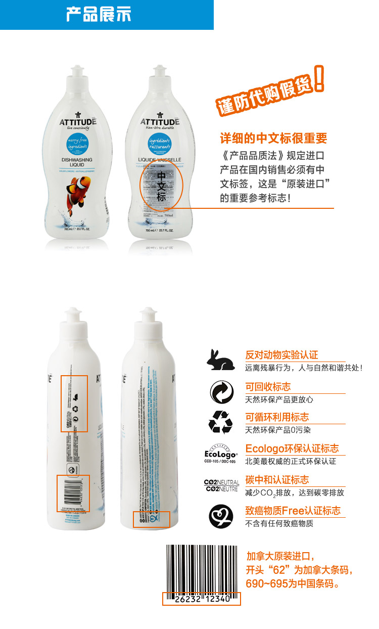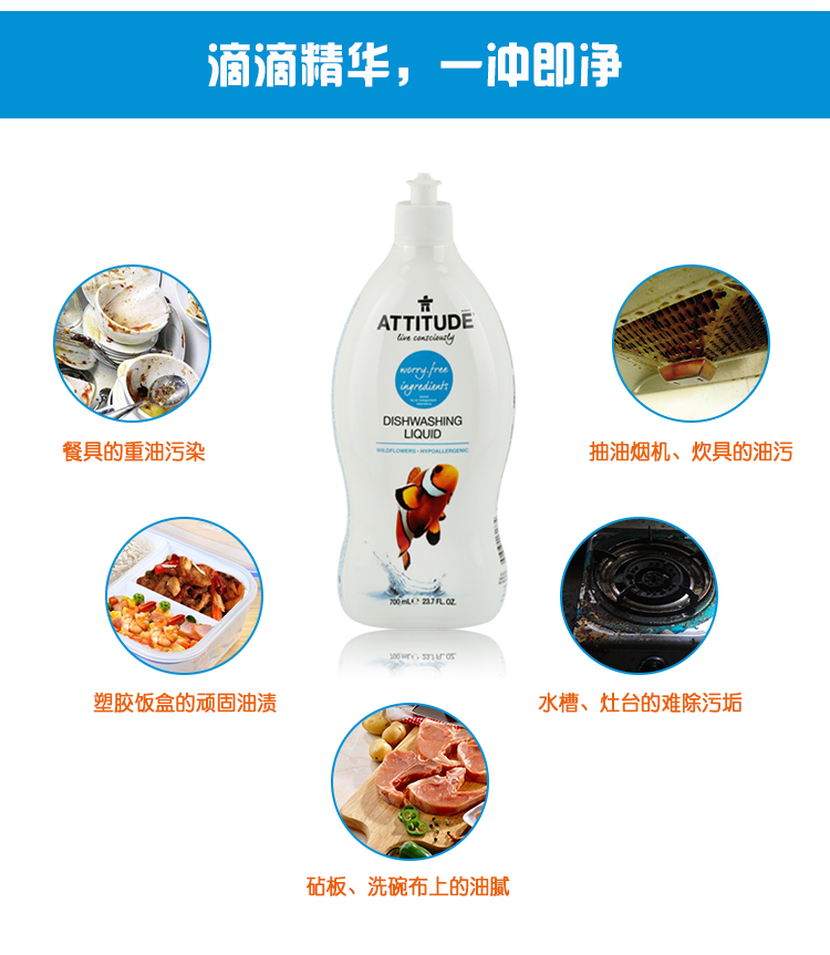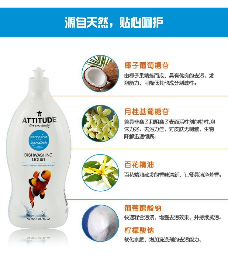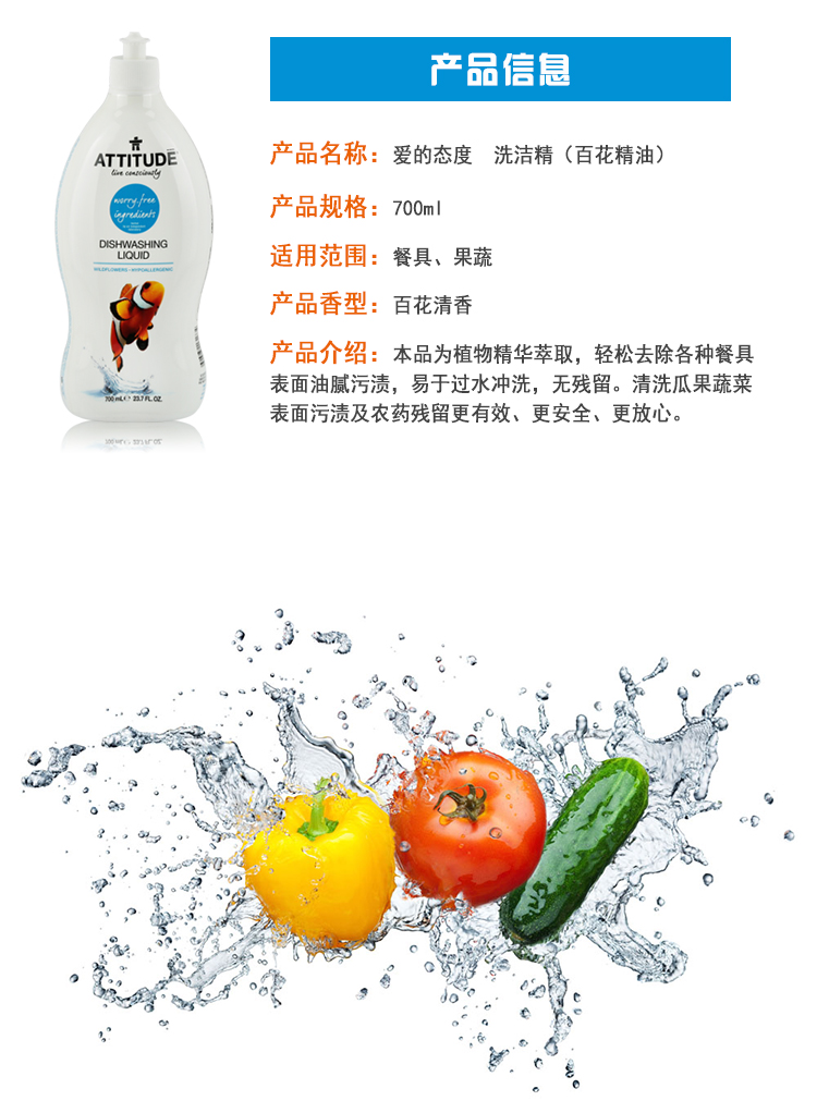 加拿大福生源进口 ATTITUD爱的态度洗洁精(百花精油)700ml/瓶