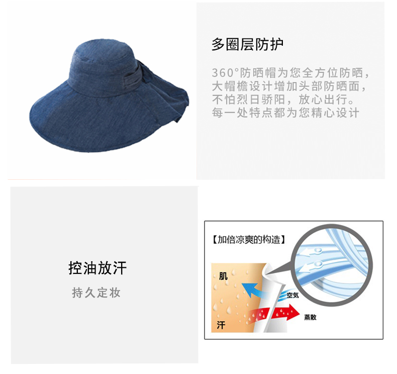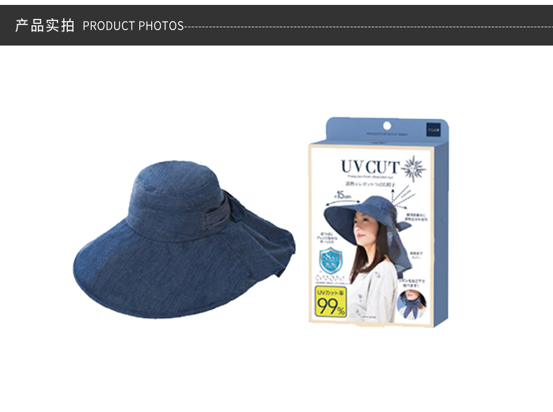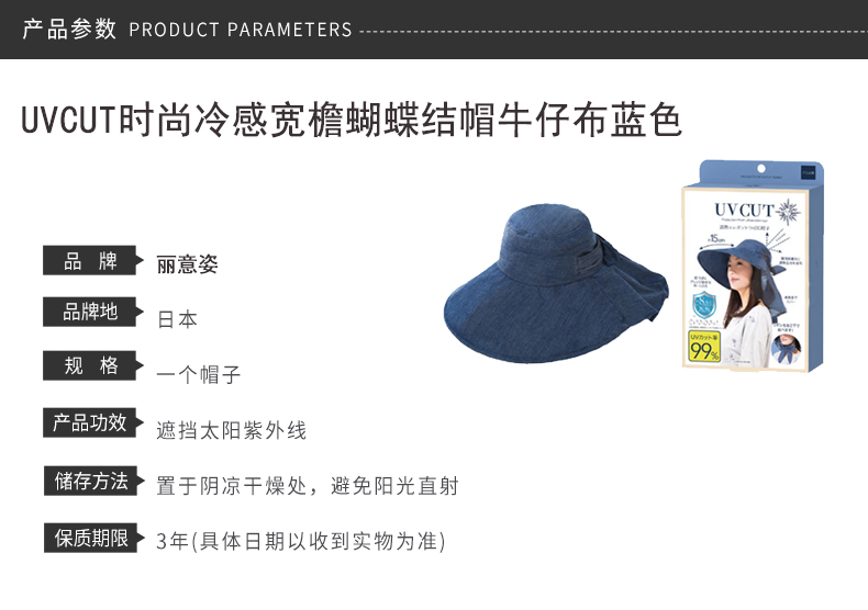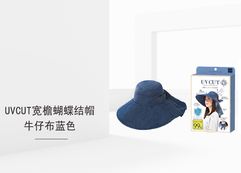 日本UVCUT丽意姿时尚冷感宽檐蝴蝶结帽牛仔布蓝色