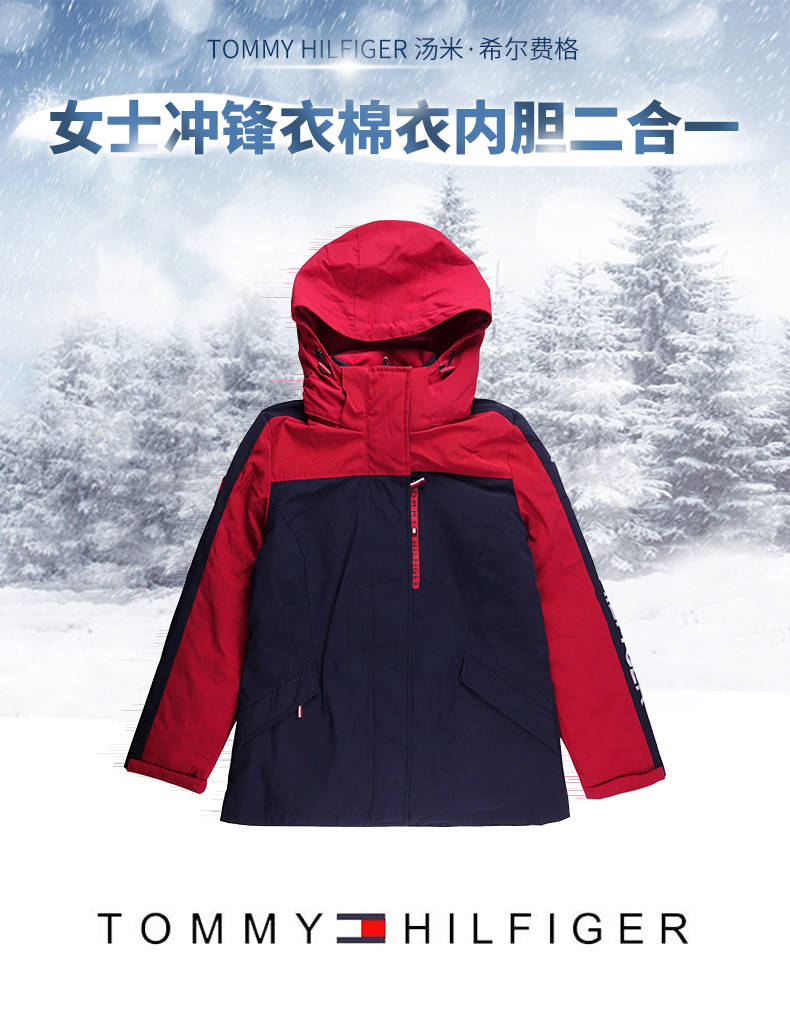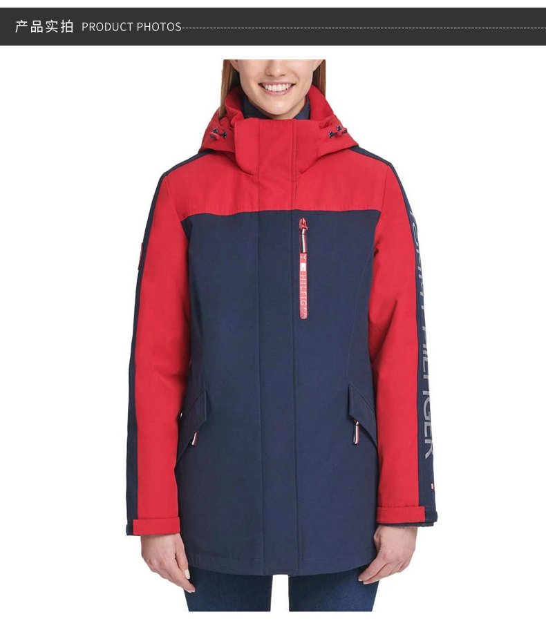 美国Tommy hilfiger汤米TH女士冲锋衣棉衣内胆二合一保暖舒适蓝红色L码