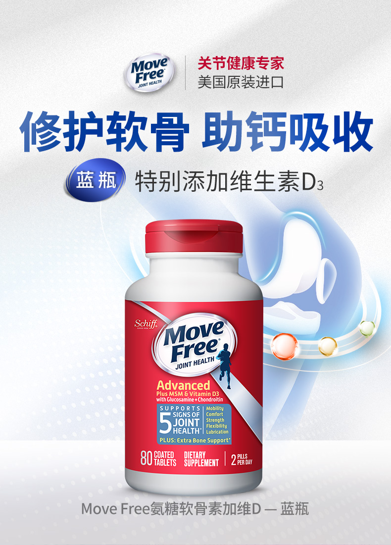 您所在的位置:首页 > 营养保健  > 营养健康 > 骨骼健康  > 【保税直邮】Move Free维骨力氨糖软骨素钙加维D片 蓝瓶80粒