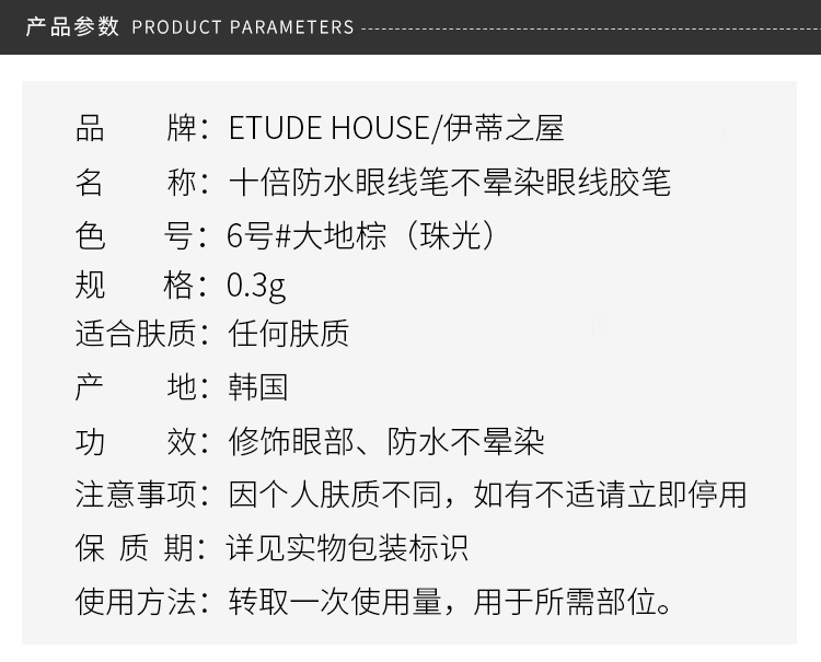 您所在的位置:首页 > 美妆护肤  > 香水彩妆 > 眼线笔/眼线液  > 【韩国直邮】ETUDE HOUSE伊蒂之屋 10倍十倍防水眼线笔不晕染眼线胶笔 6号#大地棕(珠光) 0.3g