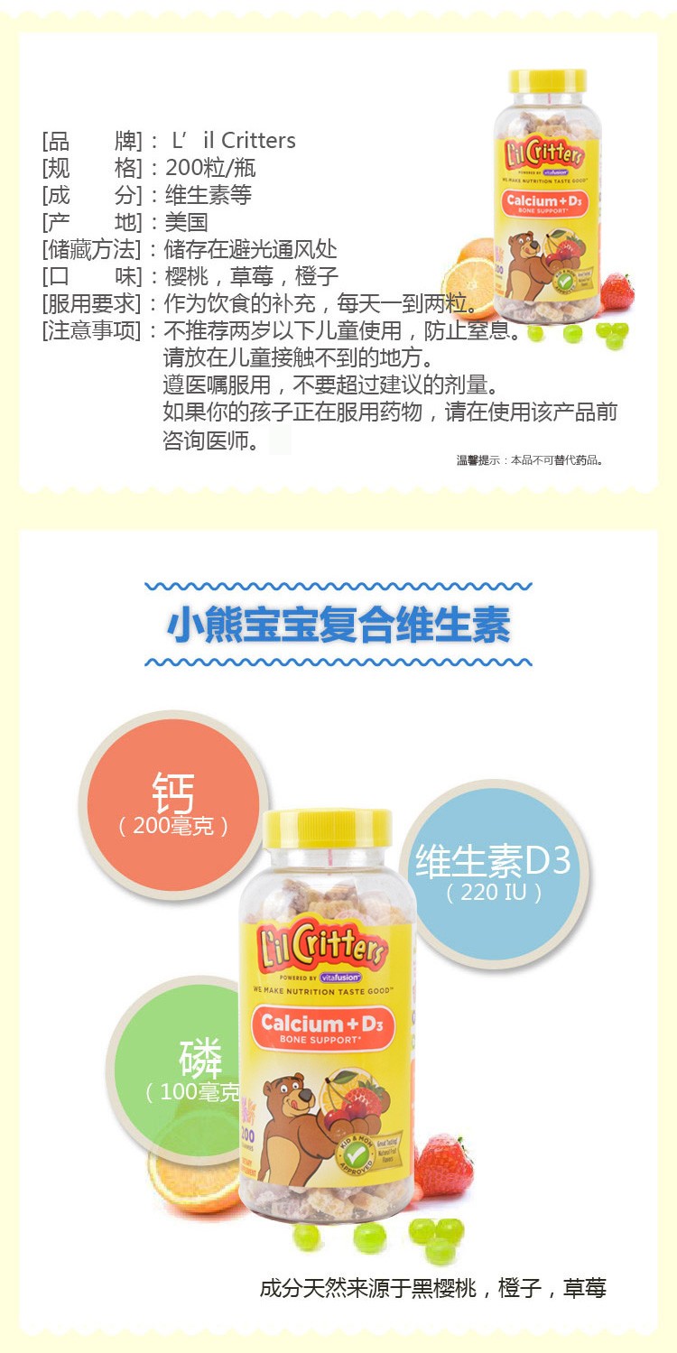 【美国直邮】L'il Critters熊宝宝丽贵小熊糖钙+维生素D补钙VD软糖200粒