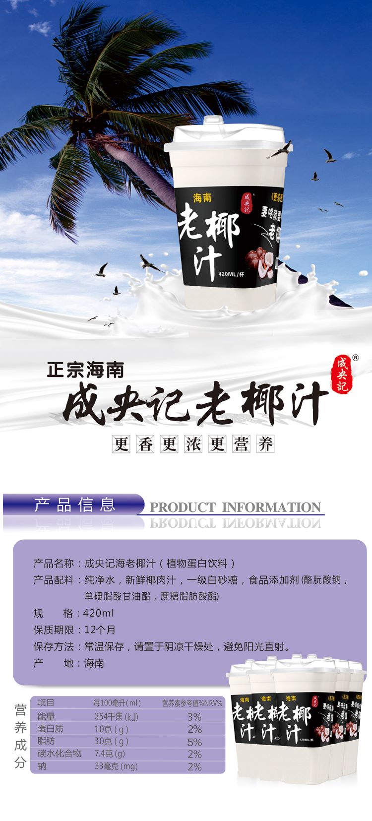 正宗海南成央记老椰汁椰奶饮料鲜榨整箱椰子汁特产 420ml*6