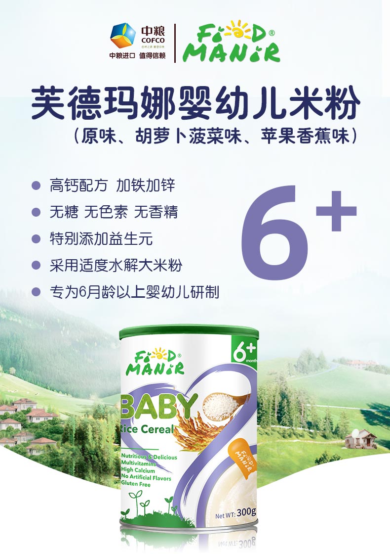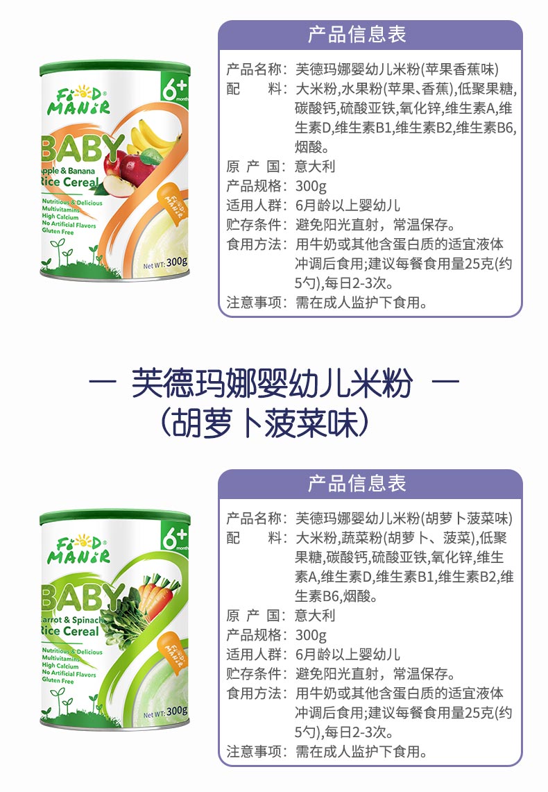 意大利进口 芙德玛娜婴幼儿米粉 原装进口有机大米粉宝宝辅食婴儿原味米糊 胡萝卜菠菜味300g/罐