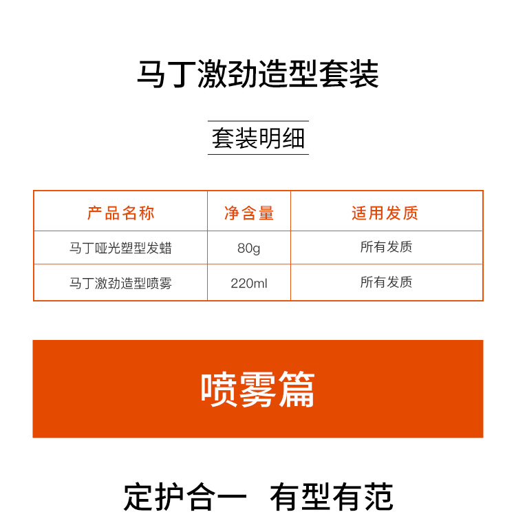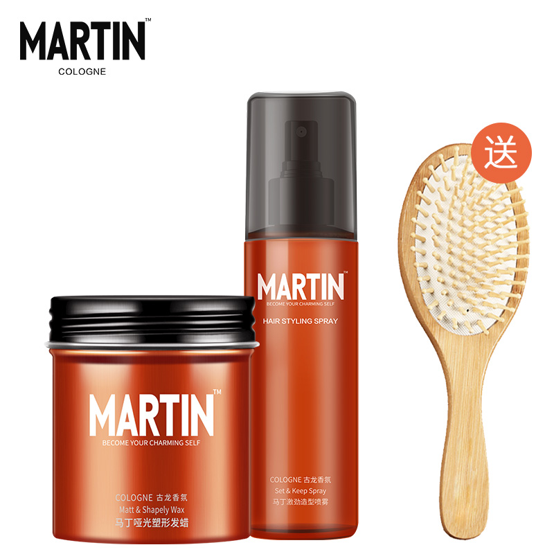 Martin/马丁男士发蜡持久定型发胶喷雾头发造型发泥自然蓬松哑光清香无味套装 塑型发蜡-窄口80g+激劲造型喷雾220ml