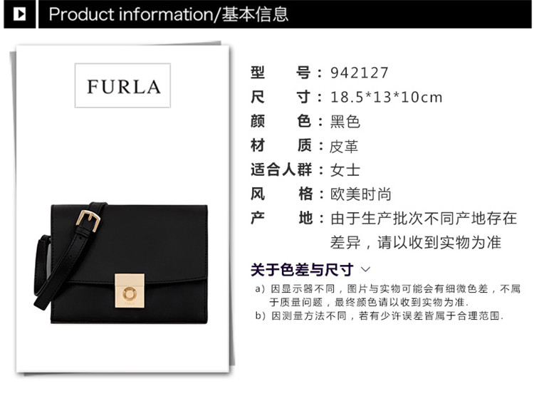 【香港直邮】Furla 芙拉 女士黑色单肩包 942127