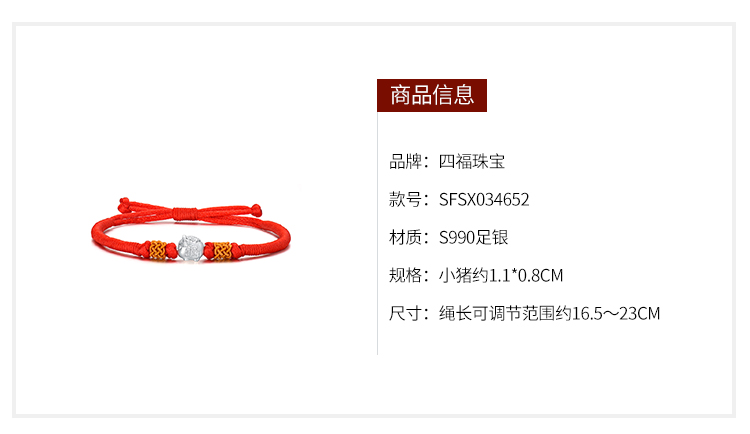 四福珠宝 S990足银小猪手链2019年本命年生肖猪红绳手链手串
