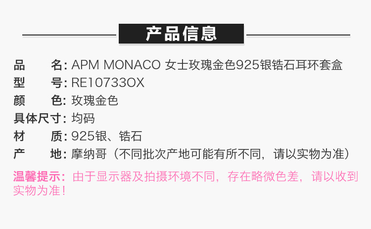 APM MONACO 女士玫瑰金色925银锆石耳环套盒 RE10733OX