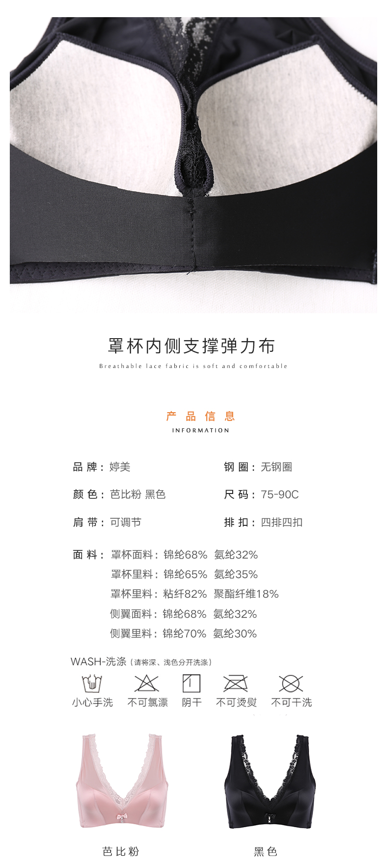 婷美新品无钢圈背心式文胸女聚拢小胸性感调整型收副乳女士内衣 芭比粉 【下单请备注尺码】