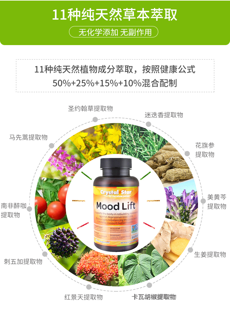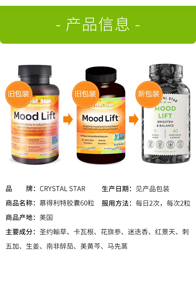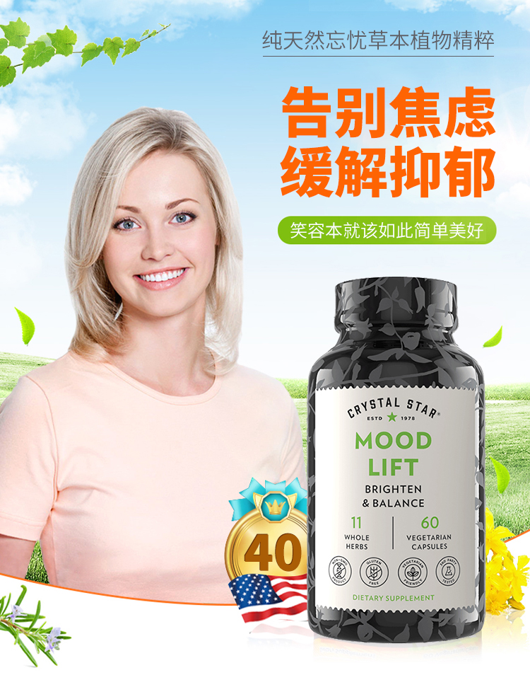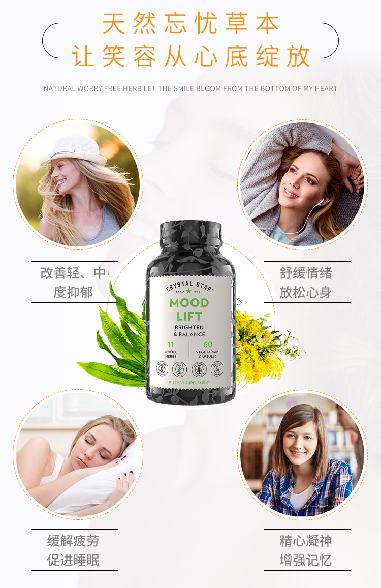 Crystal Star抗焦虑失眠抑郁减压多巴胺镇定剂天然忘忧草本慕得利特胶囊60粒 版本随机发【美国直邮】