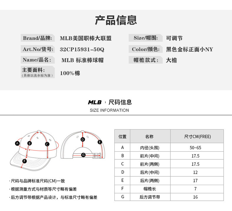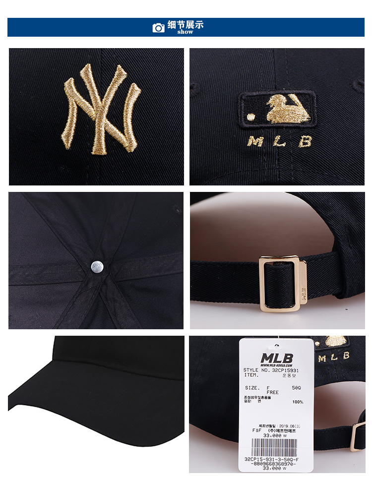MLB 美职棒棒球 软顶黑色金标正面小NY棒球帽32CP15931-50Q