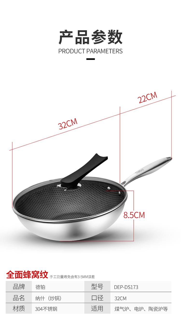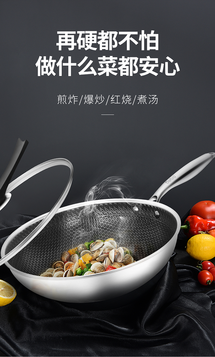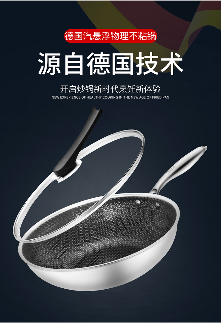 德国Debo德铂纳什蜂窝不锈钢炒锅304不锈钢可视锅盖