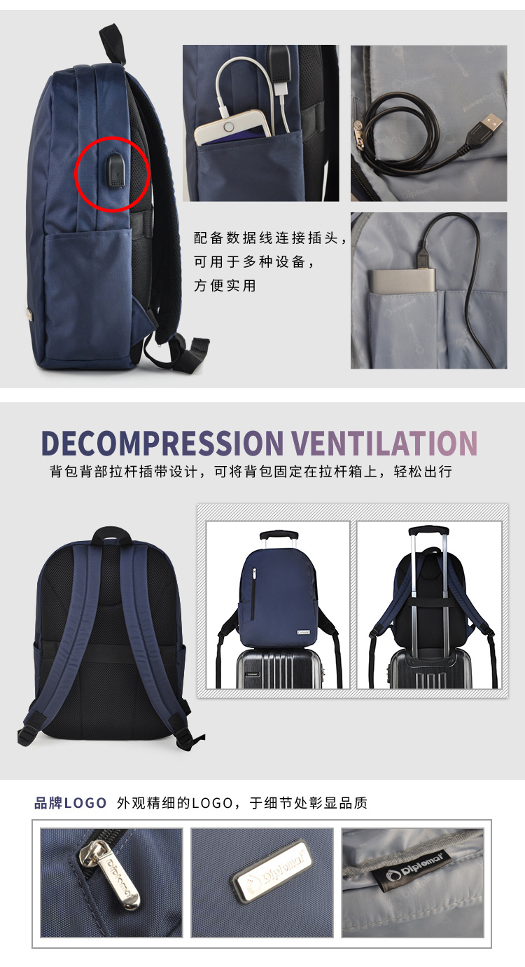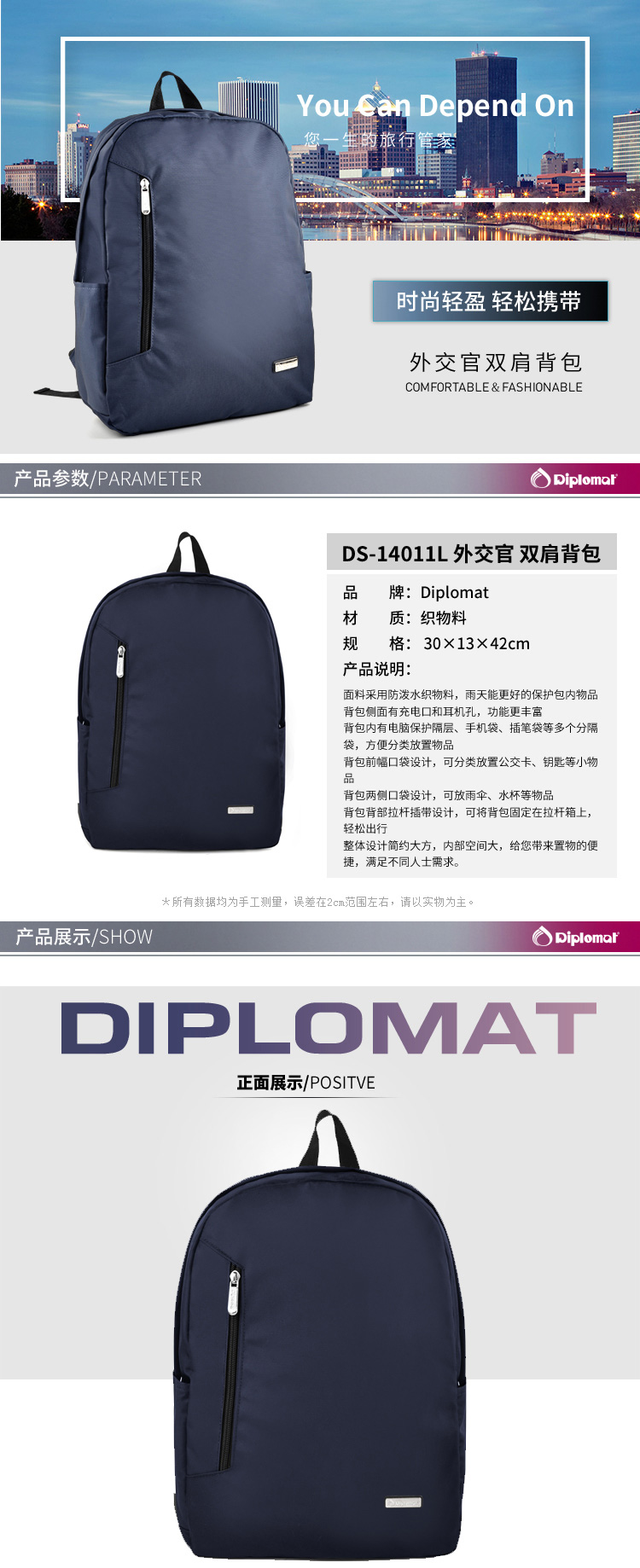 【授权商品】外交官Diplomat 休闲蓝色双肩包DS-14011LDB 深蓝色
