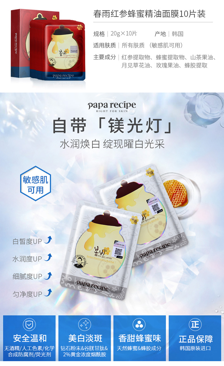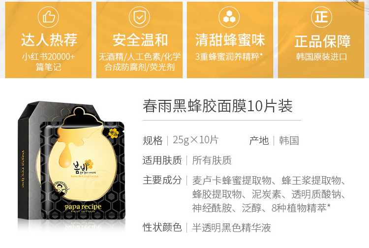 【韩国直邮】春雨papa recipe 黄色经典蜂蜜补水面膜10片/盒