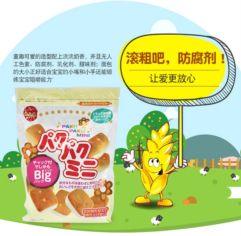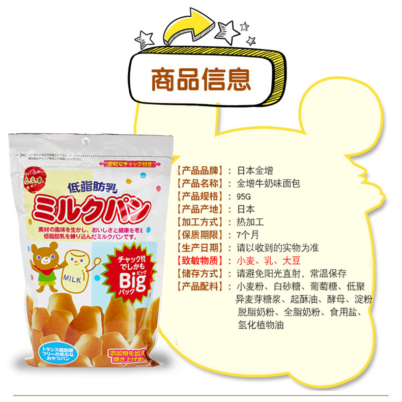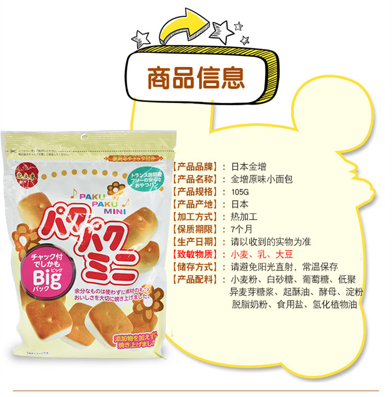 日本进口金增小面包牛奶蔬菜味宝宝营养辅食小零食儿童糕点早餐(原味105克)
