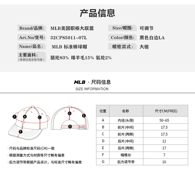 MLB 美职棒棒球 黑色白边LA棒球帽32CP85011-07L