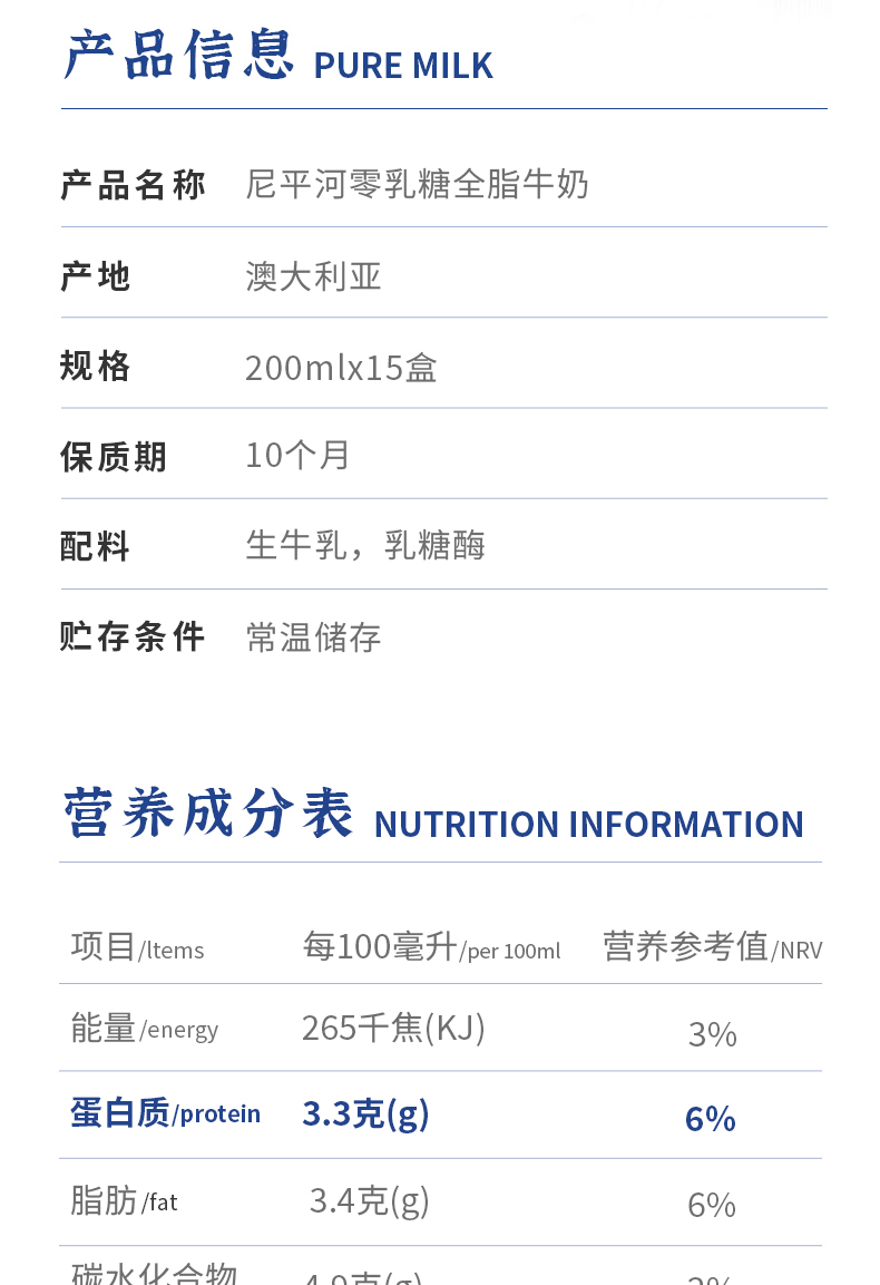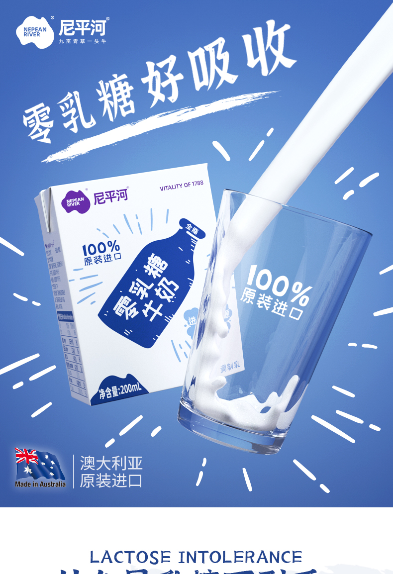 澳洲进口 尼平河 零乳糖全脂牛奶200ml*15盒装